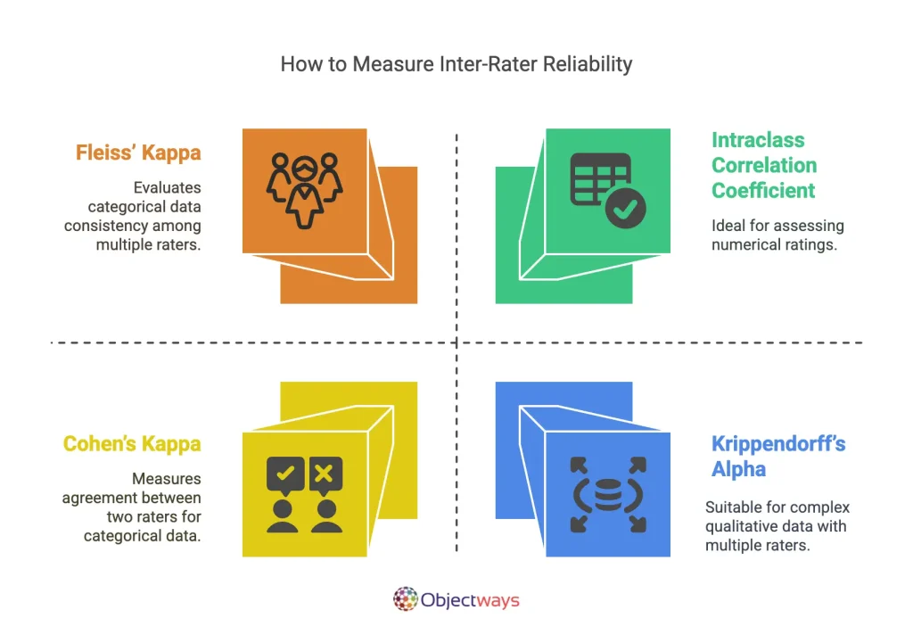 • Intraclass Correlation Coefficient (ICC): If your ratings are numerical instead of categorical, ICC is the tool to use. It assesses how reliably different raters measure the same thing, with scores ranging from 0 (no consistency) to 1 (perfect consistency).